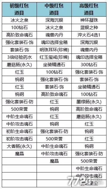 红包分为初级红包、中级红包、高级红包,不同级别红包奖励是不同,红包奖励详情如下: