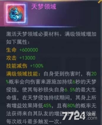 满级领域技能:自身受到伤害时,有20%概率会向伤害来源施加持续6秒的天梦侵蚀,使其每秒损失自身6.5%最大生命值,在天梦侵蚀持续期间,其身上所有增益效果降低45%,且有80%的概率无法获得来自其队友的增益效果,该效果每次战斗最多触发一次。