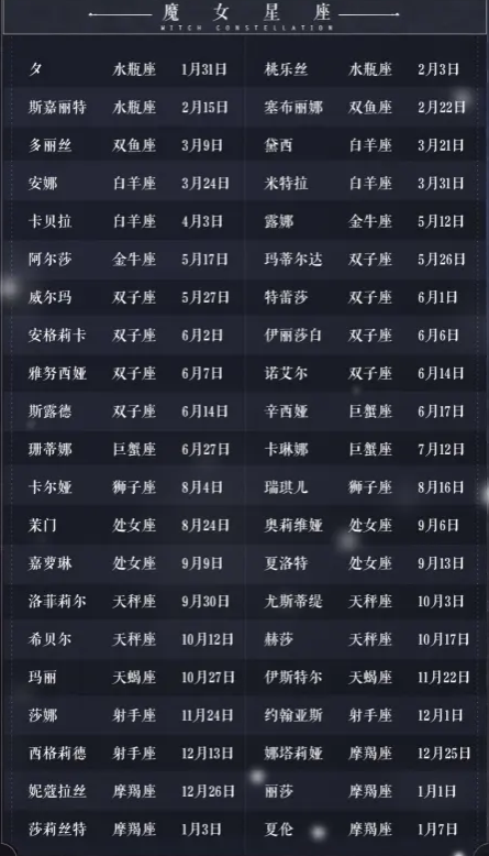 爆裂魔女星座跟星图息息相关,因为不同星座魔女的星图是不一样了。玩家可以通过下面这张魔女星图生日表来了解下,下面就让我们一起来看看吧。