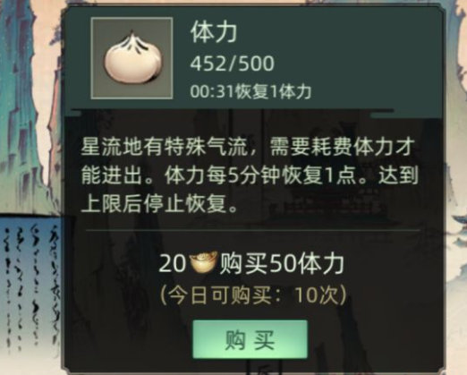 (2)元宝购买,价格随购买次数升高,因此建议购买20元宝的价格即可。20元宝=50体力