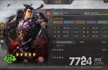 我们可以看到吕布的初始武力就达到100,而且成长属性可达到3.04,可以说是所有武将当中武力值最高的,同时吕布速度也是很快的,意味着吕布拥有很快速出手速度,配合战法突袭效果,可以说是战力爆表!