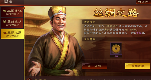 就是三三国志战略版丝绸之路活动,想要了解更多游戏资讯就请关注三国志战略版官网专区。这里有你们想要的各种游戏攻略,除此之外,还有游戏礼包哦!具体的领取方法可以通过三国志战略版礼包中心领取,可以尝试搜索7724+三国志战略版手游来获得领取地址,欢迎各位玩家前来了解。