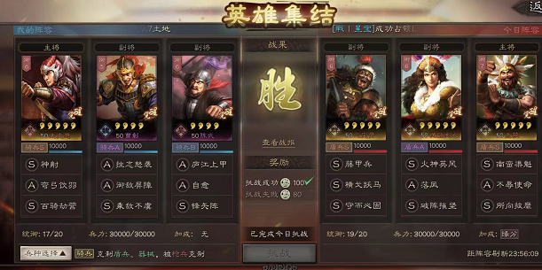 这套是典型的火攻克制藤甲兵,需要袁术触发几次战法才行,选择刘哗可以增加袁术的触发概率,也是需要两到三次才能顺利通过。