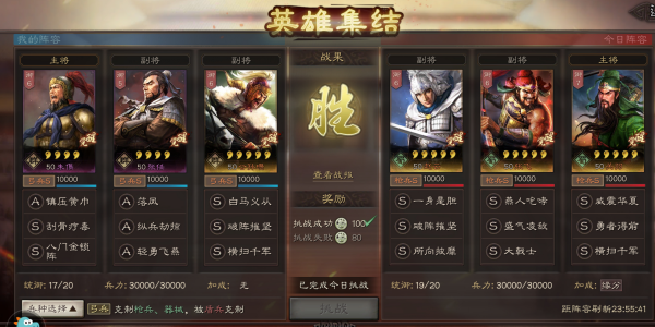今天的阵容就是这样子了,这次活动难度也会逐渐提升,相信后面会有各种比较难打的阵容组合。不过只要遵循兵种克制,战法克制关系,那么想要击败对面是比较简单了,这也算是三战的一种玩法,玩家根据武将战法搭配,组成阵容克制打败对面,也变相说明游戏中没有无敌阵容,而是根据各种玩法搭配组成的克制而已。