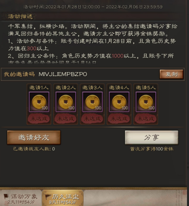 这个活动你把PMBMCXDVMYBJ这个邀请码输入后,那么就可以领取福利奖励了。而邀请人会根据邀请人数来获得金铢。每邀请1人获得100金铢,大概获得500金铢需要邀请5个玩家,因此这个是一个非常不错的福利活动。对于新老玩家来讲,都是可以领取金铢和白嫖武将的一种途径吧,毕竟每年春节三国志战略版总是会回归一波玩家,也就过年的时候有时间玩这款游戏了。