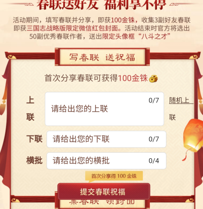 这次官方出了一个对对联的比赛,让玩家写一个对联然后进行对比投票。很多玩家肯定是在纠结写什么对联好,这里我来给你们分享一下比较好的对联,如果你们不知道鞋什么的话可以参考一下吧。