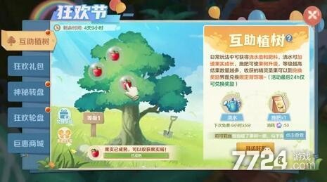 每位玩家活动期间只有1颗数,而且接受好友浇水次数也是有限制的,最多只有6次,可以加快果实成3个小时,更多需要玩家自己主动去浇水,而浇水道具是可以通常日常任务得到,果树成熟时间是24小时。