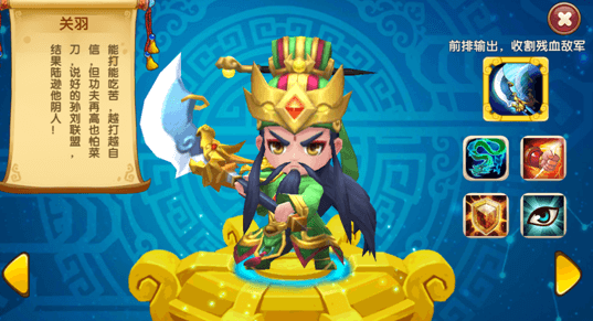 关二爷在游戏中也是非常厉害的存在,首先这个角色只需要签到或者参加军团就可以获取。技能是随机对一个目标造成伤害,并且周围也会受到溅射伤害。他的特点是大招附带斩杀效果,对于低于35%生命值的角色附带50%的伤害,因此收割能力非常不错,可以当做前排主力来使用。